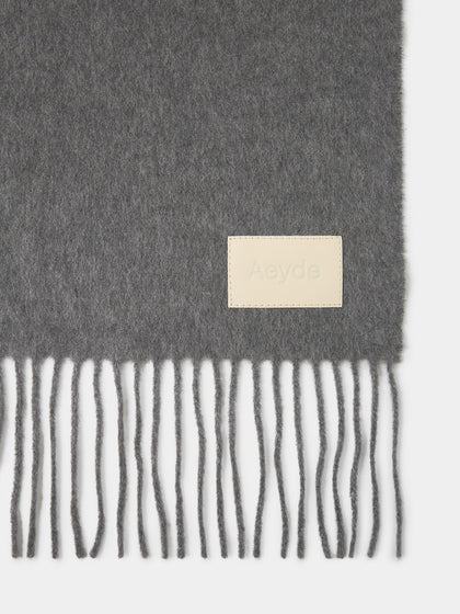 Bela is Aeyde's classic scarf, made from soft cashmere with fringe detailing and a brand-embossed leather label.