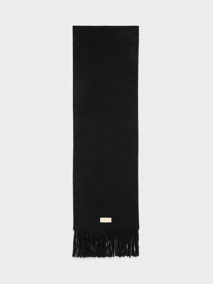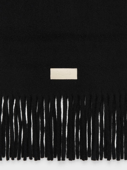 Bria is a chunky wool scarf with long fringe detailing and a brand-embossed leather label.
