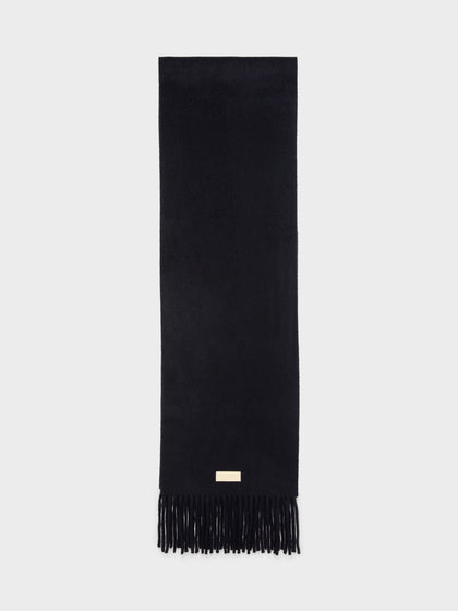 Bria is a chunky wool scarf with long fringe detailing and a brand-embossed leather label.