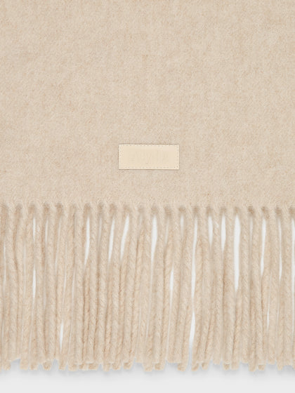Bria is a chunky wool scarf with long fringe detailing and a brand-embossed leather label.