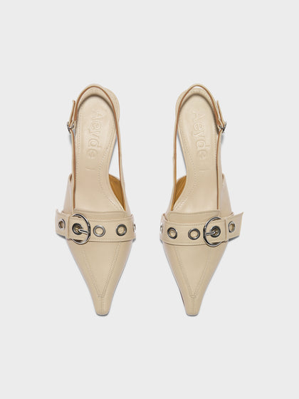 Taking cues from early '00s design, Davina's sculpted, pointed shape is elevated with an eyelet-studded detail, signature Aeyde buckle, and barely-there slingback strap.