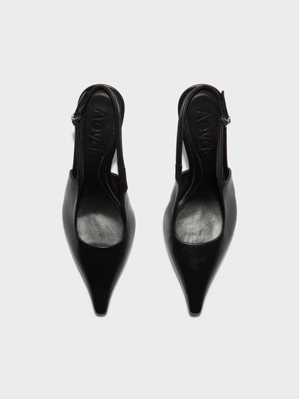 Fernanda are Aeyde's elegant chisel-toe pumps featuring tapered mid-height heels, adjustable slingback straps, and bespoke anti-slip soles.
