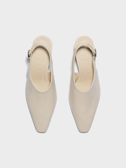Maude is our sleek slingback mule with a subtly angled heel and A-shaped toe. Finished with our signature round buckle, it balances impact with wearability.