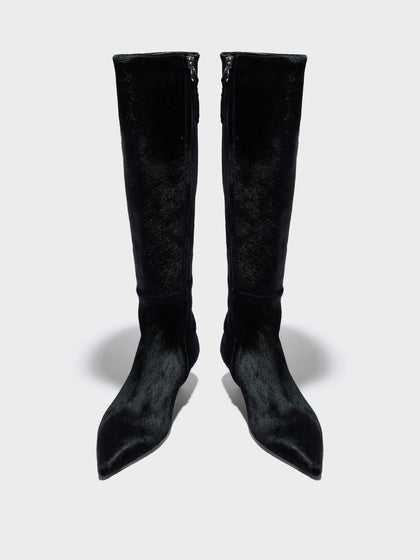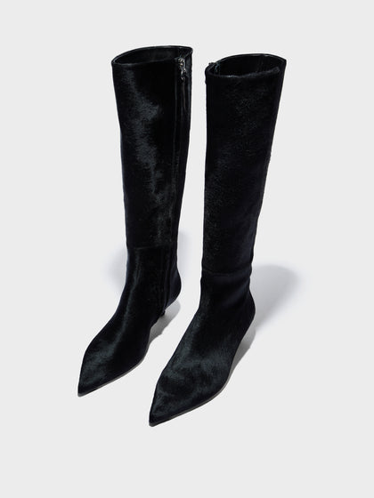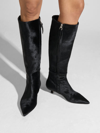 Sabrina is a fitted boot balanced on a delicate kitten heel, crafted in tactile pony hair and finished with a pointed toe for a touch of elegance.